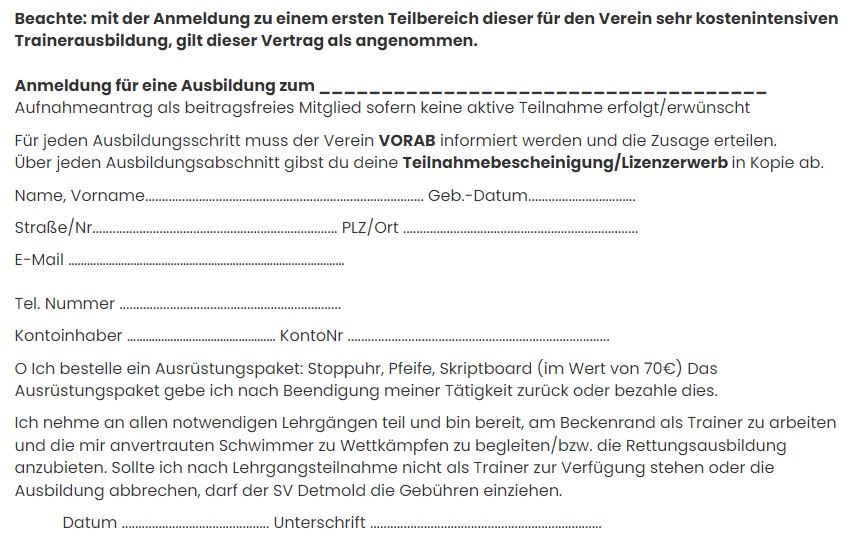 Ich nehme an allen notwendigen Lehrgängen teil und bin bereit, am Beckenrand als Trainer zu arbeiten und die mir anvertrauten Schwimmer zu Wettkämpfen zu begleiten/bzw. die Rettungsausbildung anzubieten. Sollte ich nach Lehrgangsteilnahme nicht als Trainer zur Verfügung stehen oder die Ausbildung abbrechen, darf der SV Detmold die Gebühren einziehen.